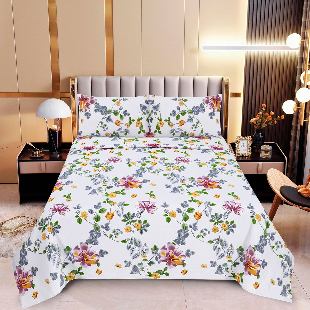 Category:  3 Pcs Printed Stitched Bedsheet Set Packages Contain:  Size: 01 Flat Sheet    / 95 x 100 Inches 02...